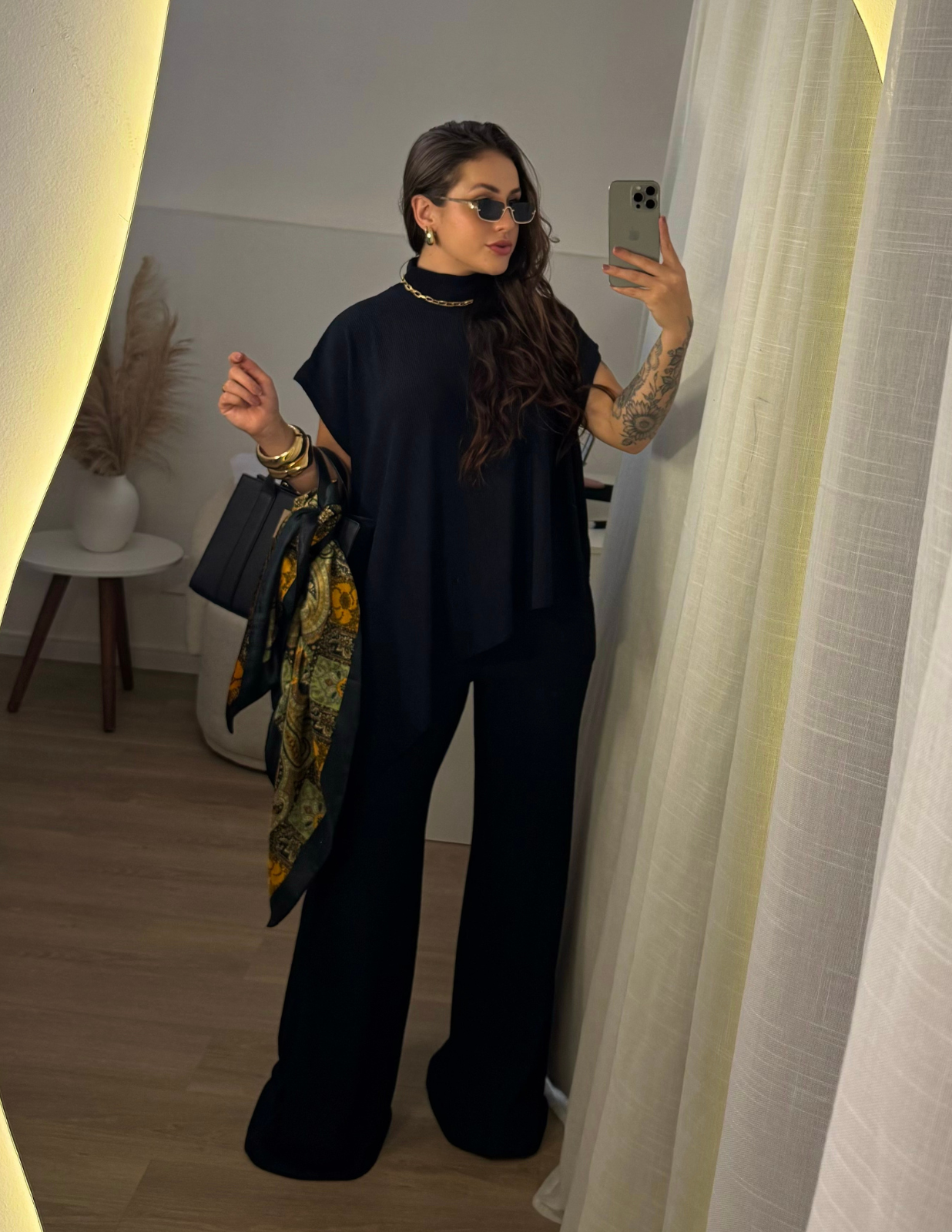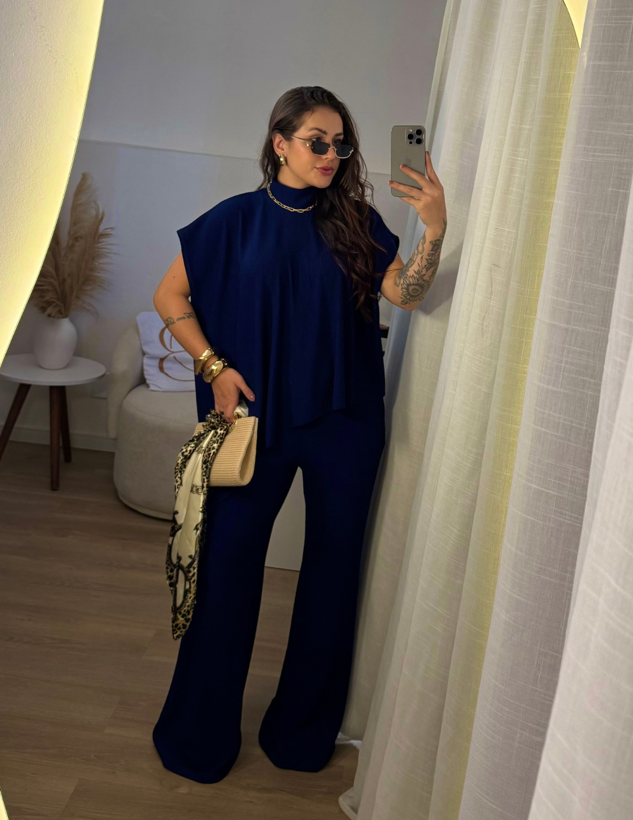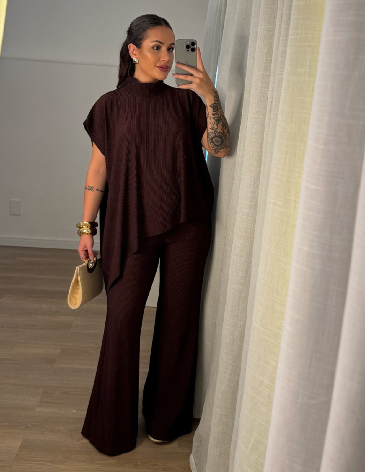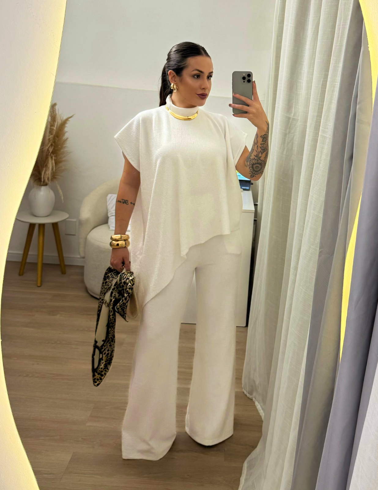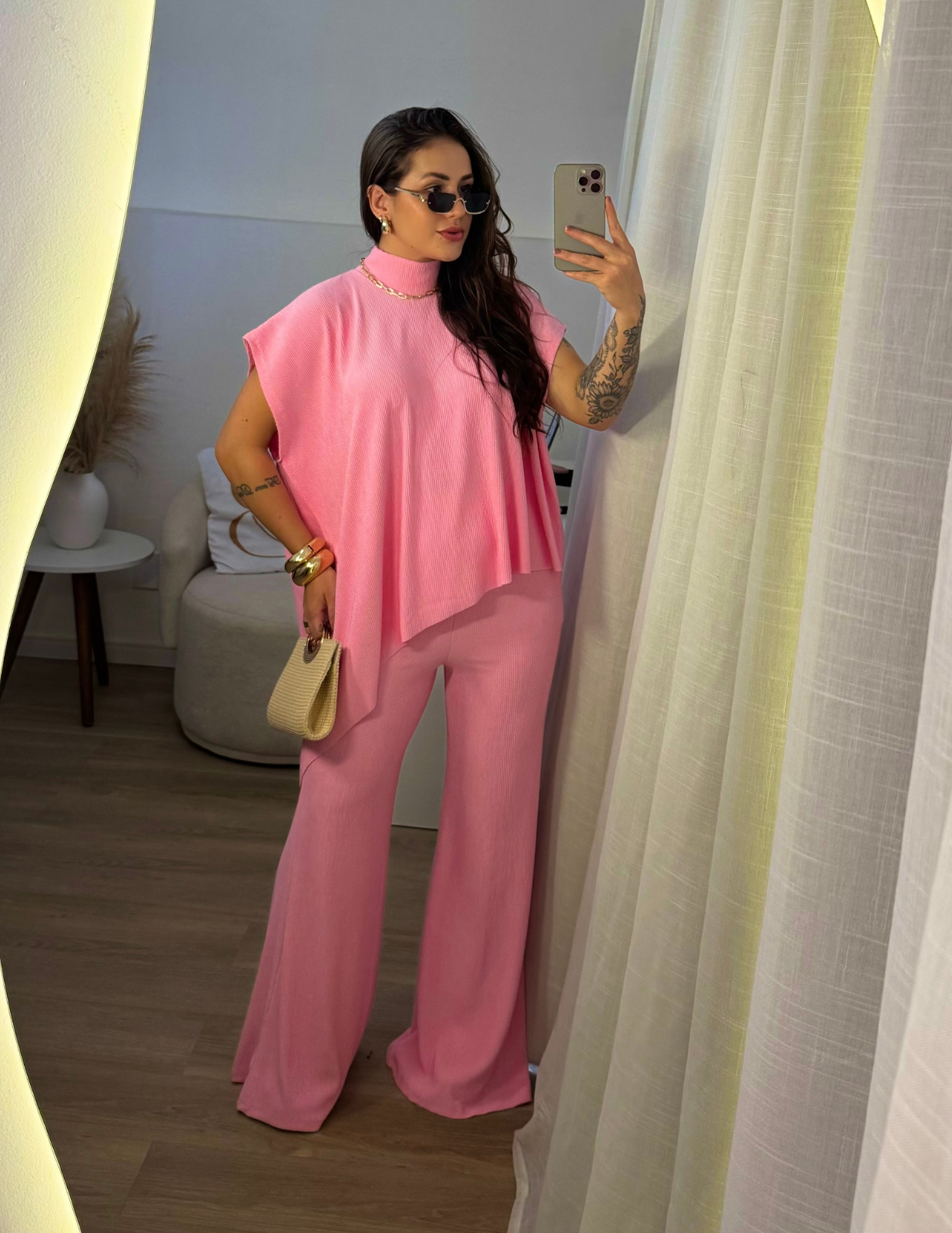 Conjunto assimétrico com gola alta, confeccionado em tecido leve que não amassa e possui excelente elasticidade. A blusa tem corte moderno e caimento soltinho, garantindo elegância e conforto. A calça estilo pantalona conta com elástico na cintura, proporcionando ajuste perfeito e muito conforto. Ideal para compor looks sofisticados e atuais para diversas ocasiões.