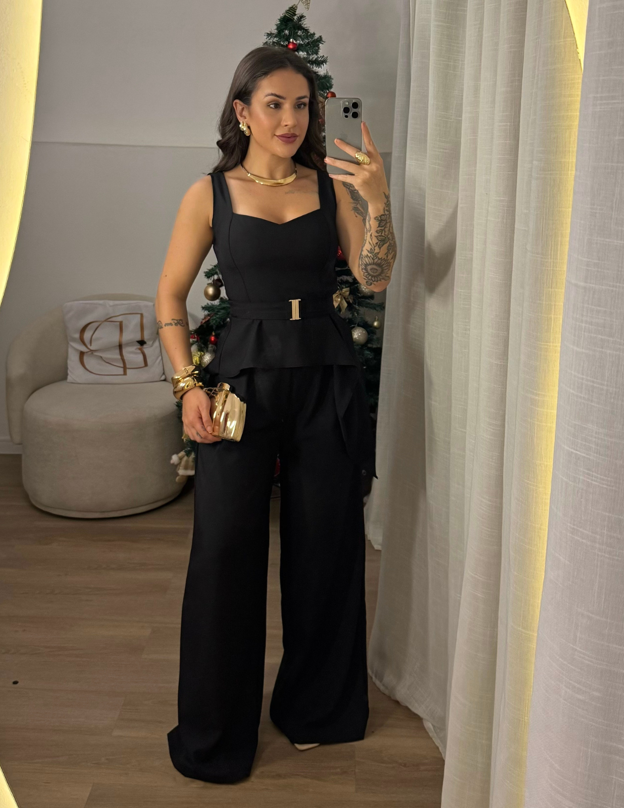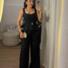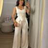 Conjunto elegante composto por blusa de corte assimétrico com bojo e elastex na parte de trás, que garante ajuste e conforto. Acompanha cinto do mesmo tecido para valorizar a cintura. A calça em modelagem pantalona possui elástico na cintura e fechamento em zíper na lateral, oferecendo caimento fluido e ajuste prático. Peça sofisticada e versátil, perfeita para composições do dia a dia ou ocasiões especiais.